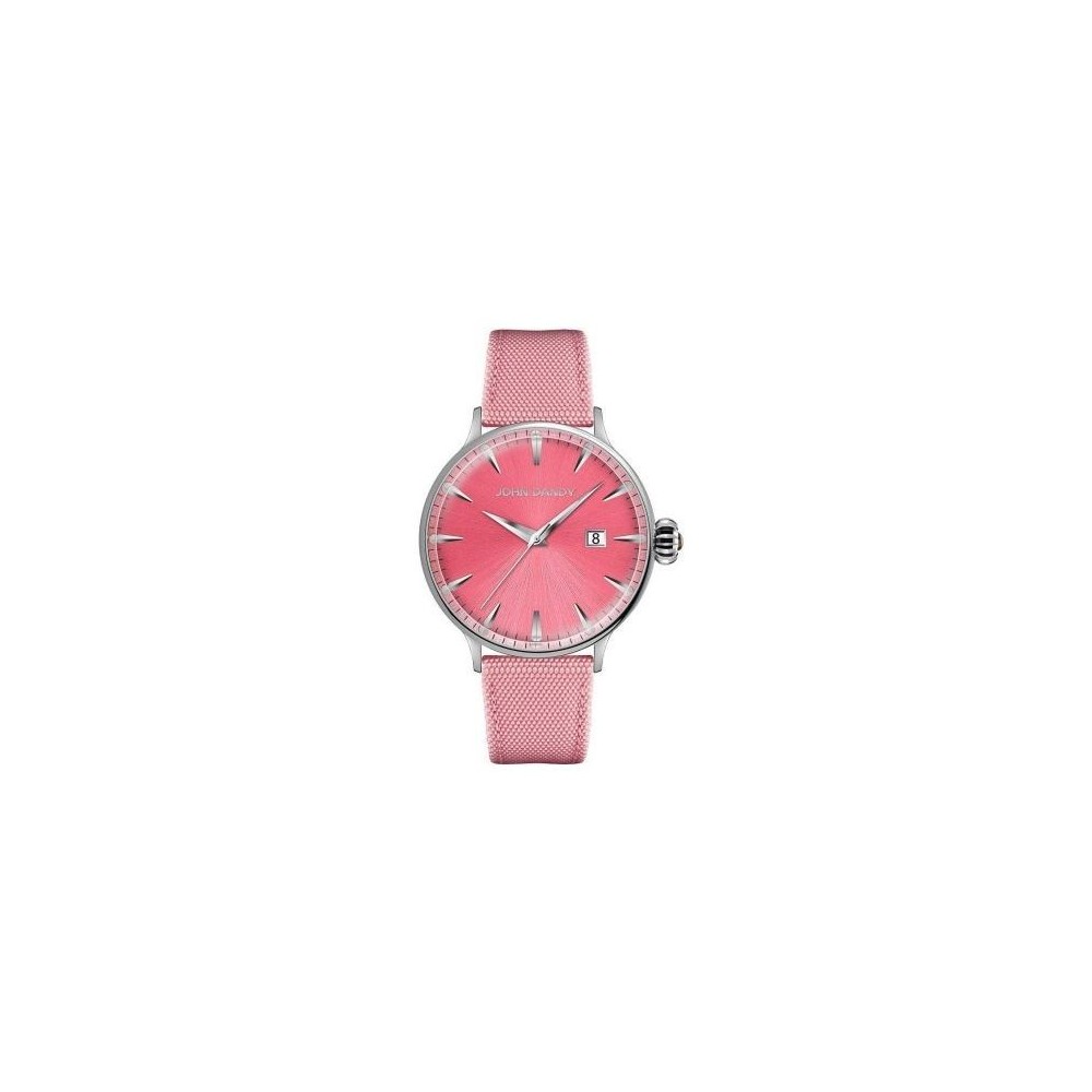Un esclusivo ed elegante orologio da donna,il movimento è al quarzo Seiko 2115,la cassa in acciaio argentato con il diametro da 36 mm lo spessore da 08 mm,il quadrante di color rosa sunray con gli indici a bastoni e le lancette argentate,il datario posizionato sulle ore 3,vetro minerale anti shock e graffio,water resistant 30 metri 03 atm,il bracciale è in tessuto color rosa con la chiusura di sicurezza a fibbia in metallo argentato. Swiss made - John Dandy JD-2609L-16