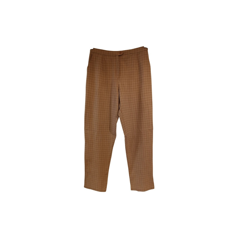 Pantalone da donna in tessuto di lana vergine 49% viscosa 48% elastan 03% color cammello/beige a quadretti marrone scuro il modello fashion di tendenza senza passanti in vita a gamba dritta con 2 tasche anteriori alla francese chiusura a zip taglia 46 Italiana (17 Marina Rinaldi). pnd183. Lunghezza 112 cm. giro vita 86 cm. lunghezza del cavallo 32 cm. larghezza dei fianchi 61 cm. lunghezza dell'interno gamba dal punto del cavallo alla caviglia 82 cm. larghezza della caviglia 22 cm. In eccellenti condizioni. Made in Italy - Marina Rinaldi