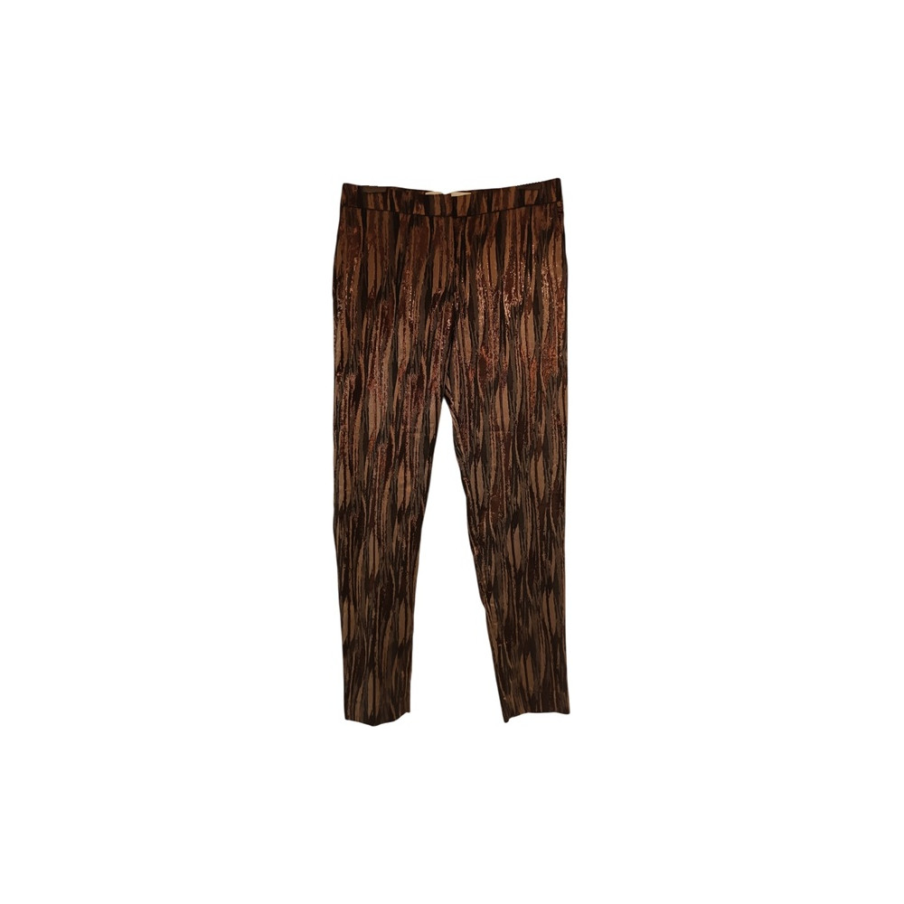 Pantalone da donna in tessuto di cotone 47% elastan 07% poliestere 50% multi color a fantasia con riflessi dorati il modello glamour di tendenza 2 tasche anteriori chiusura a zip taglia 42. pnd184. Lunghezza 97 cm. giro vita 77 cm. lunghezza del cavallo 25 cm. larghezza dei fianchi 47 cm. lunghezza dell'interno gamba 68 cm. larghezza della caviglia 14 cm. In eccellenti condizioni. Made in Italy - Nineminutes