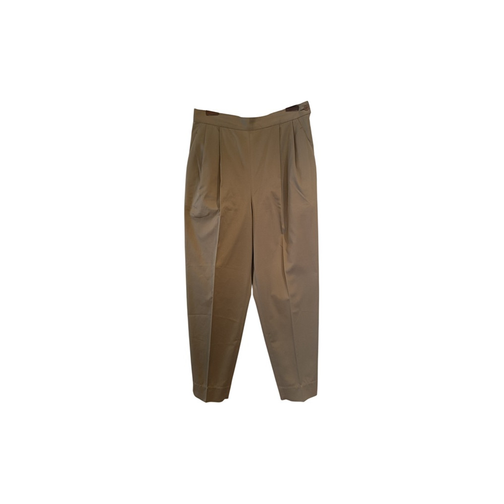 Pantalone da donna in tessuto di cotone color verde salvia il modello glamour di tendenza carrot con 2 tasche anteriori ed 1 posteriore chiusura a zip laterale taglia 42/44. pnd186. Lunghezza 103 cm. giro vita 80 cm. lunghezza del cavallo 34 cm. larghezza dei fianchi 59 cm. lunghezza dell'interno gamba 69 cm. larghezza della caviglia 18 cm. In eccellenti condizioni. N.B. E' sprovvisto della targhetta taglia e composizione tessuto. Made in Italy - Allegri